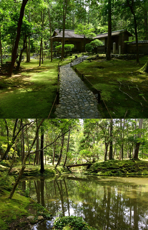 夢窓疎石が創り上げた西芳寺庭園は、上段に「枯山水庭園」、下段に「池泉回遊式庭園」を配した 二段構えの広大な庭園となっています。 現在見られる苔の庭は下段にあり、黄金池と呼ばれる心字形の池を中心に、 島や小さな橋などが配置されています。